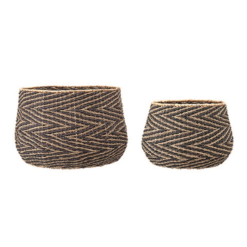 The black chevron design on these handwoven seagrass baskets will add warmth and needed contrast to a bright room d?cor. Fill with potted plants or use to hold miscellaneous throw blankets and games for a cozy night around the fireplace. In the bedroom, use one for a laundry basket and the other as a catch-all for shoes.