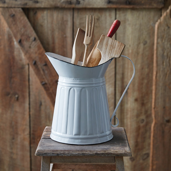 Keep things simple with our ivory milk pitcher. This item is made of metal and can be used to decorate with fresh picked or artificial flowers. Its edges are lined with distressed black color.