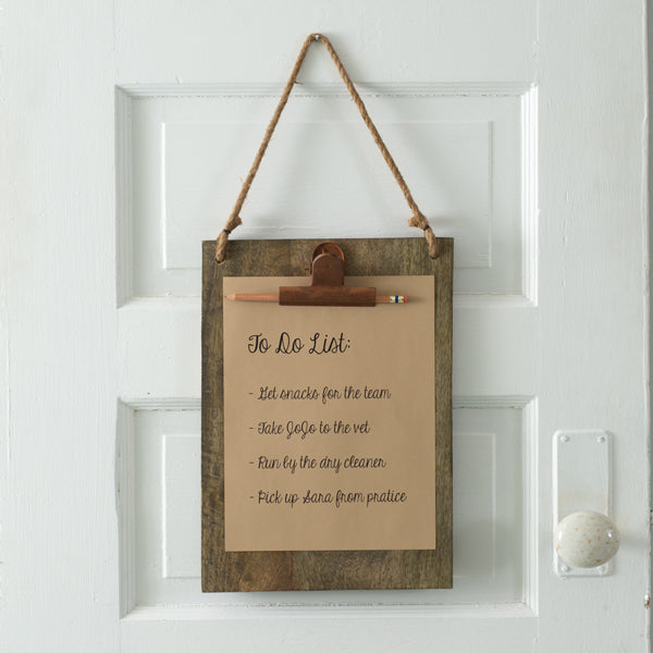 Display your chore list or photos and cards on this sturdy wooden clipboard. It features a rustic clip and a jute rope to hang from. This item will fit in with any farmhouse décor.