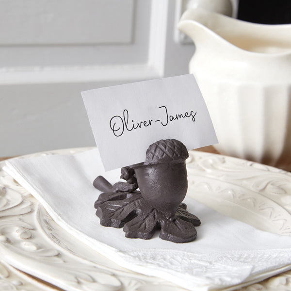 Keep your celebration organized and charming! This acorn place card holder will be a great addition to a fall wedding, banquet, or buffet. This sturdy acorn is made of cast iron.
