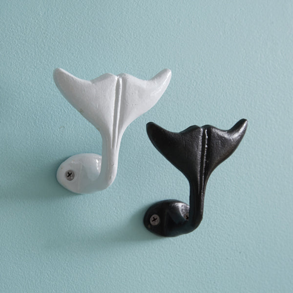 Ideal for coastal decor, these Set of Two Whale Flukes will be great to hang towels, robes, or aprons from. These hooks are made of iron with a black and white finish. Display in a beach kitchen or bathroom for style and organization.
