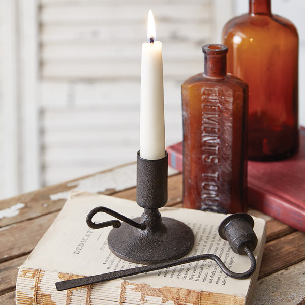Step back in time with this taper candle holder, inspired by old-world charm. Made from cast iron, this candlestick holder will add stability while the snuffer will allow you to easily extinguish your candles without any messy drips or smoke. The snuffer measures 6¾''W x 1¼''D x 2''H. Taper candle not included.