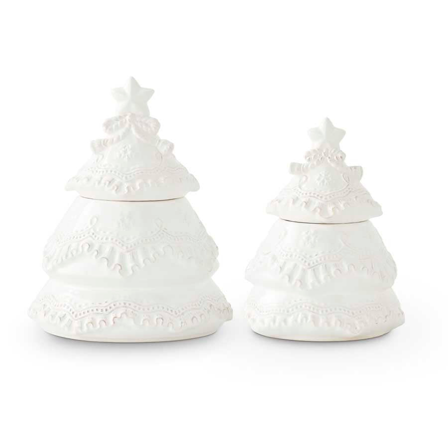 These pure white Christmas tree cookie jars are true stunners! Whether you place your favorite holiday candies or fresh baked goods into these sweet jars, they are sure to grace your home with pure beauty.