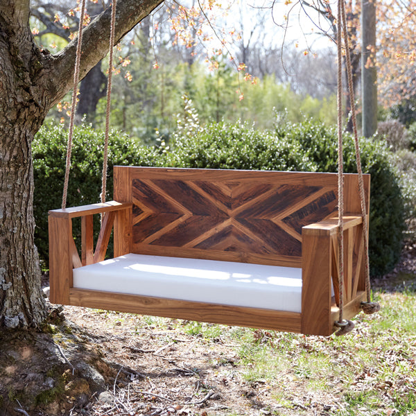 Hang this sturdy, petite swing from a covered porch and make a statement with its bold chevron backrest. It comes with a 50 foot customizable jute rope with red accents that is ½"" dia. for hanging. Also, it includes a plush 100% cotton cushion to make the experience very relaxing. This piece is made from solid mango wood. Real wood is a product of nature, and as such, no two pieces are alike. Variations in grain, patterns, and color are to be expected and help create a beautiful and unique one-of-a-kind piece. This item comes fully assembled.