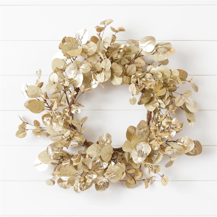 Our festive shimmer wreaths are ready to bring sparkle to your home! Featuring eucalyptus and other foliage painted in hues of champagne - this wreath is perfect for the holiday season and well into the new year!