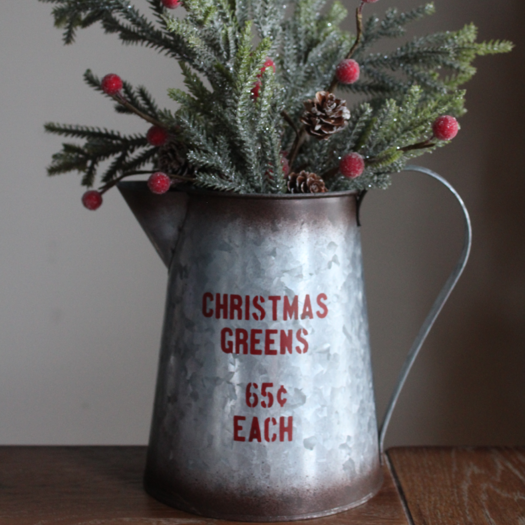 A whole lot of charm in this re-inspired galvanized holiday pitcher! With market -style stenciled wording and pricing - this "Christmas Greens - $0.65 Ea" galvanized pitcher is a fun way to display your holiday greenery and florals.
