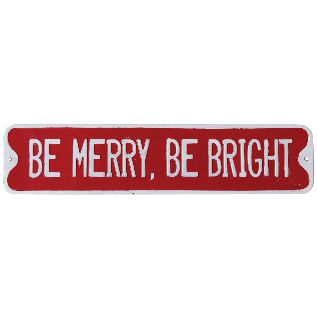 Be Merry, Be Bright Street Sign is a modern, street-style sign that features a bold red finish and stark white accents. Sign displays the phrase, "Be Merry, Be Bright, " in embossed, dimensional lettering.