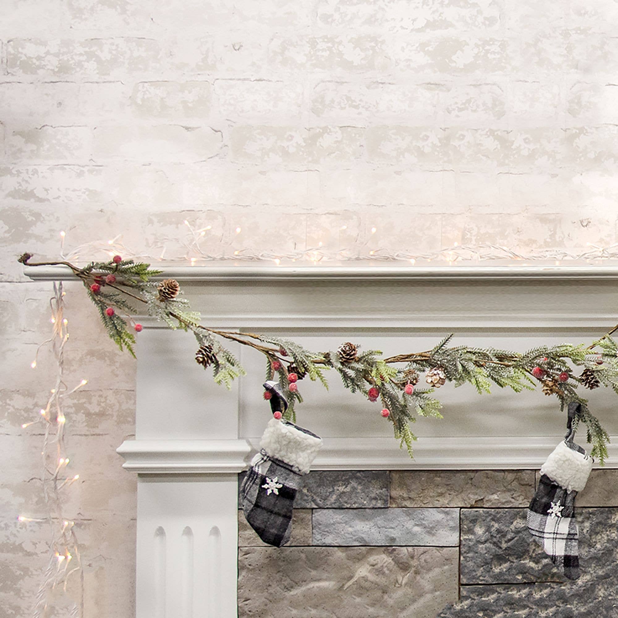 Mountain Pine with Berries Garland features a mix of icy, red foam berries and frosted mini pine cones on glittered, green branches.